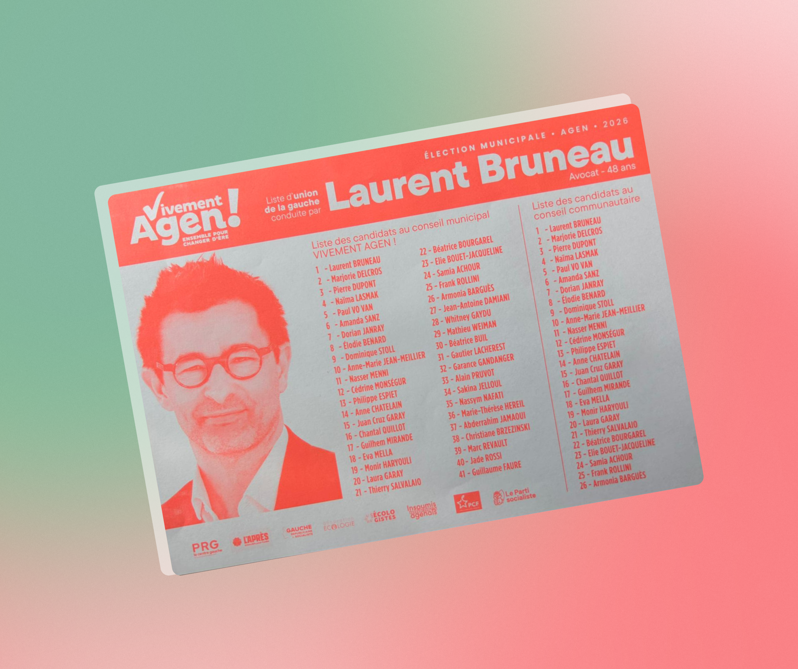 Laurent Bruneau, avocat engagé et militant associatif, est une figure active de la vie citoyenne agenaise depuis près de vingt ans. Conseiller municipal d’opposition, initiateur de plusieurs projets culturels et démocratiques, il porte aujourd’hui la liste Vivement Agen ! soutenue par l’ensemble des partis de gauche.